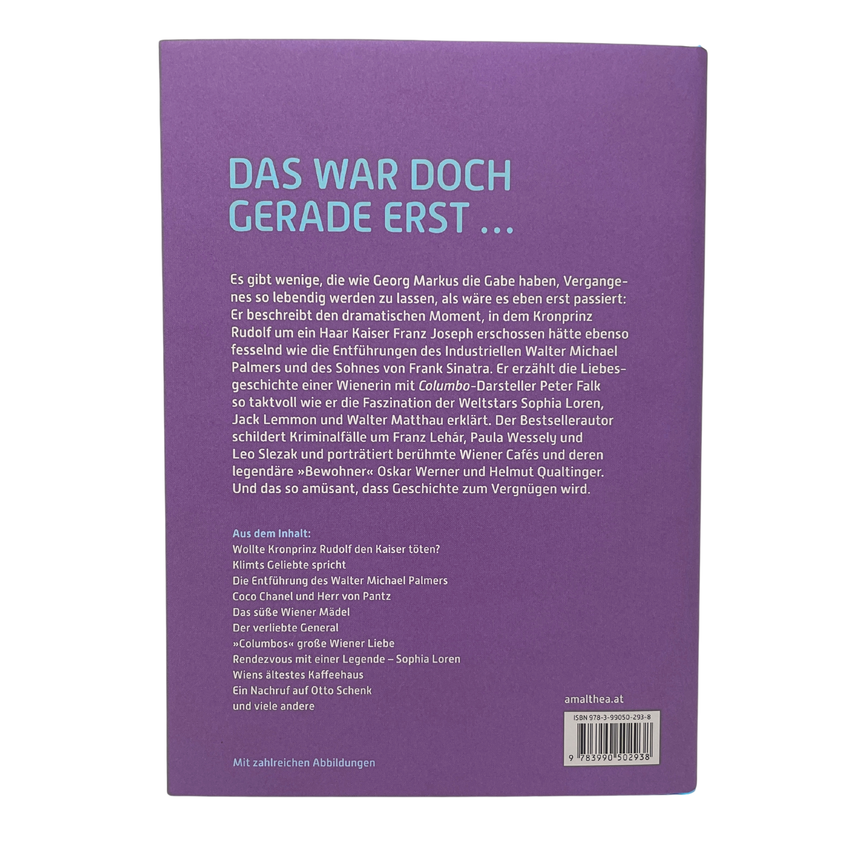 Es gibt wenige, die wie Georg Markus die Gabe haben, Vergangenes so lebendig werden zu lassen, als wäre es eben erst passiert: Er beschreibt den dramatischen Moment, in dem Kronprinz Rudolf um ein Haar Kaiser Franz Joseph erschossen hätte, ebenso fesselnd wie die Entführungen des Industriellen Walter Michael Palmers und des Sohnes von Frank Sinatra. Er erzählt die Liebesgeschichte einer Wienerin mit Columbo-Darsteller Peter Falk so taktvoll wie er die Faszination für die Weltstars Sophia Loren, Jack Lemmon und Walter Matthau erklärt. Der Bestsellerautor schildert Kriminalfälle um Franz Lehár, Paula Wessely und Leo Slezak und porträtiert berühmte Wiener Cafés und deren legendäre »Bewohner« Oskar Werner und Helmut Qualtinger. Und das so amüsant, dass Geschichte zum Vergnügen wird.