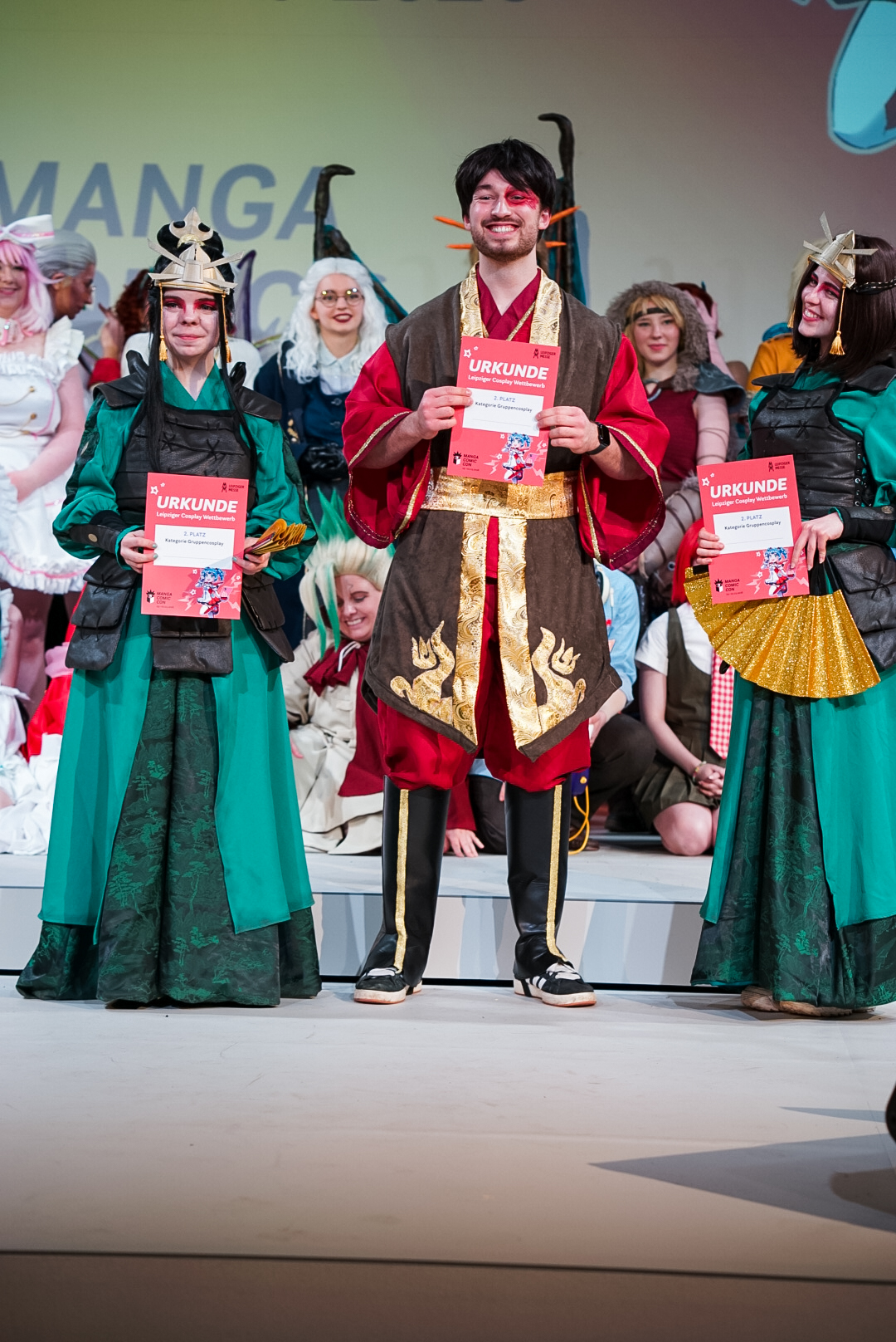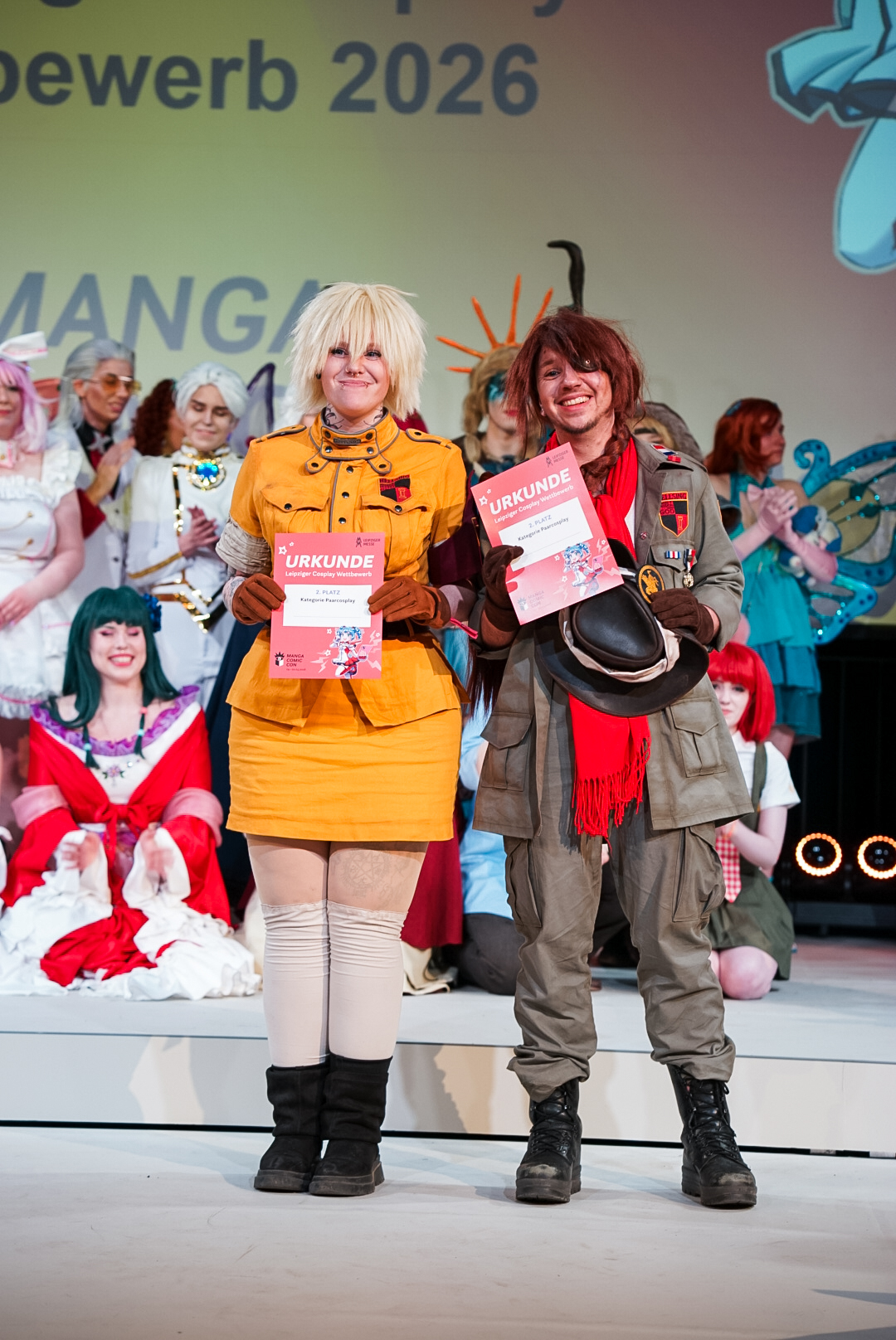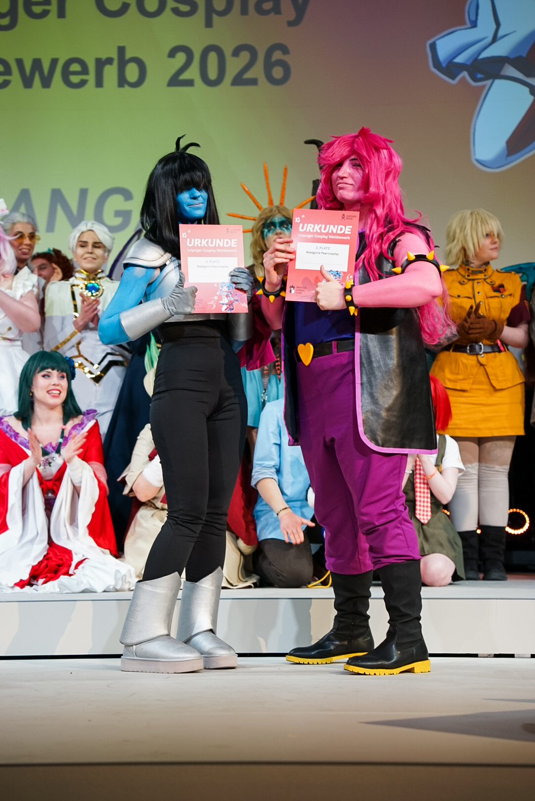 Seht hier die Siegerehrung der Plätze 1 bis 3 in den Kategorien Einzel, Paare und Gruppe des Leipziger Cosplay Wettbewerbs 2026.