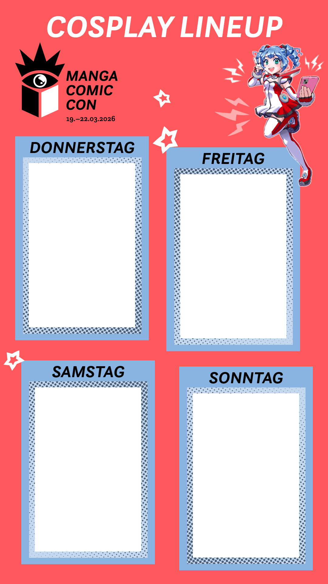 Als Nutzer:in auf sozialen Netzwerken habt ihr keinen Anspruch auf eine Antwort oder anderweitige Reaktion durch die Manga Comic Con auf eure Kommentare oder Direktnachrichten, insbesondere wenn diese unsachlich formuliert sind. Auch in anderen Fällen können wir keine Antworten oder Serviceleistungen über unsere Social Media Profile garantieren. Bitte wendet euch an unseren Besucherservice unter info@manga-comic-con.de oder telefonisch unter + 49 341 678-6953, wenn ihr Fragen zu eurem Messebesuch habt. Aussteller wenden sich bitte mit Anfragen an aussteller@manga-comic-con.de oder + 49 341 678-6953.