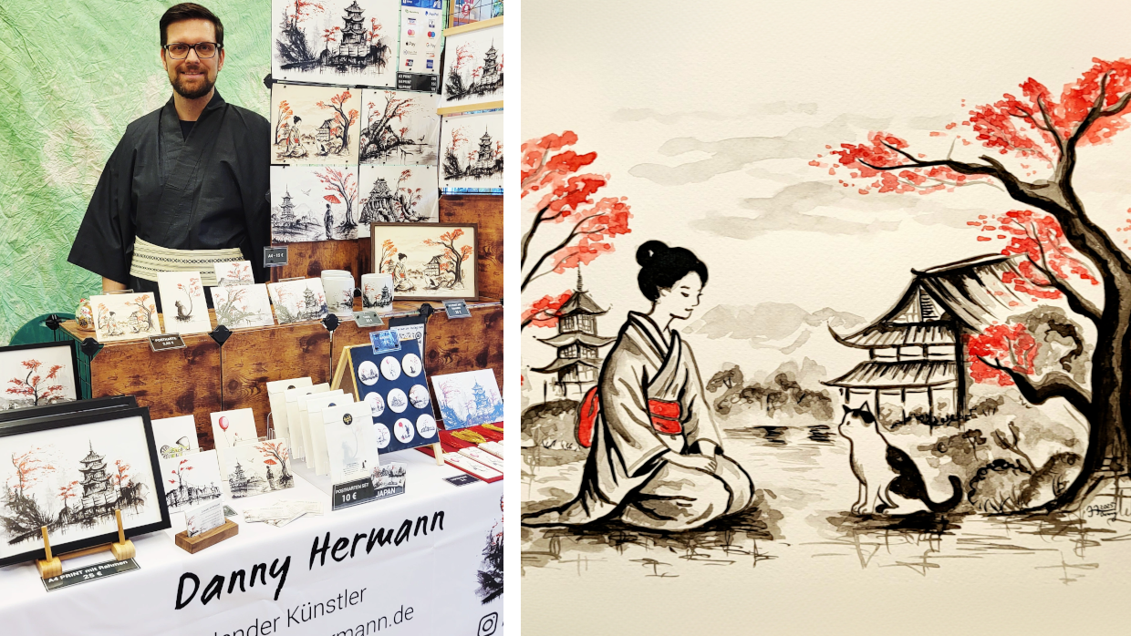 At the Leipzig Book Fair, I will be presenting for the first time a Japanese fairy tale book I have written myself, featuring ink illustrations, as well as postcards, prints, mugs, bookmarks, and more.