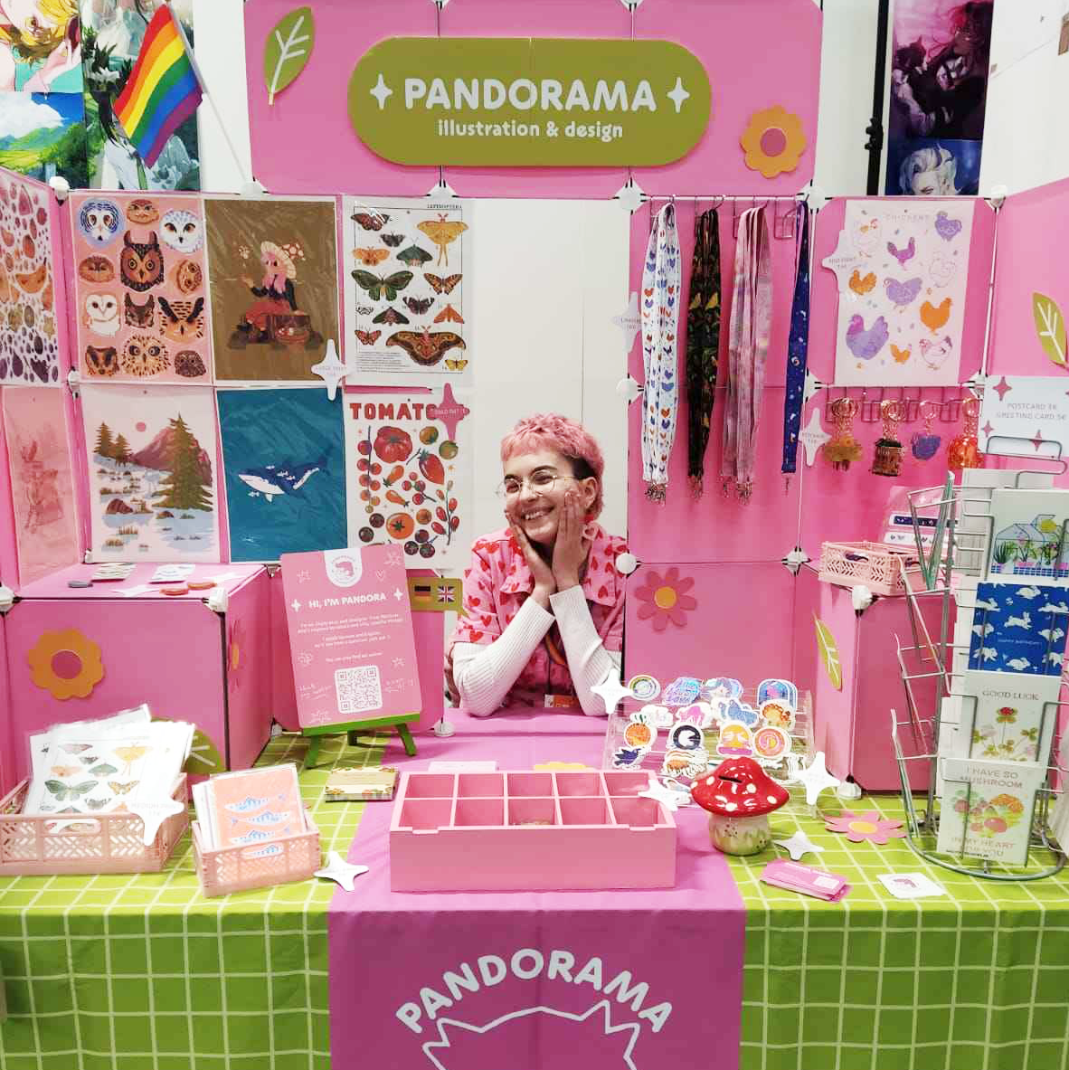 Hi, I'm Pandora :-) I'm a freelance illustrator and comic artist from Münster. My work is inspired by different printing techniques and always full of color and graphic stylizations. If you like merch and prints of funky birds or mischievous bunnies, come by my table.