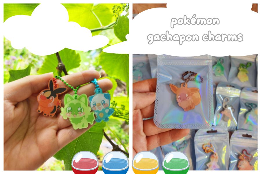The cutest little pokémon starters as charms! Spin the gachapon and get a random pokémon for a cheaper price or immediately get your favourite :)