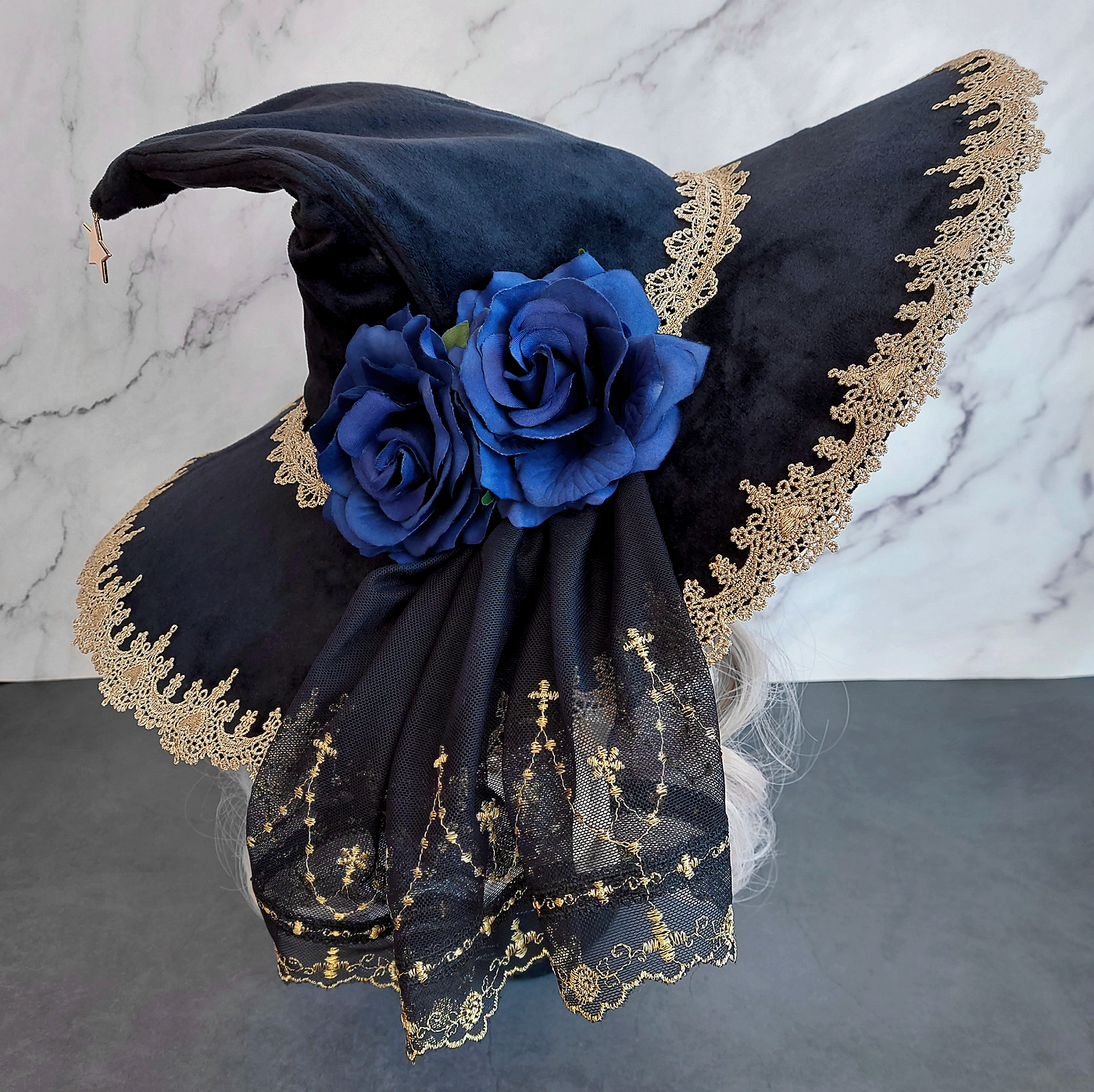 Two big blue roses decorate this big witch hat made of black velvet fabric. Right underneath lays a small veil in the colors gold and black. The golden highlights are picked up again in the rich lace you can find all around the hat.